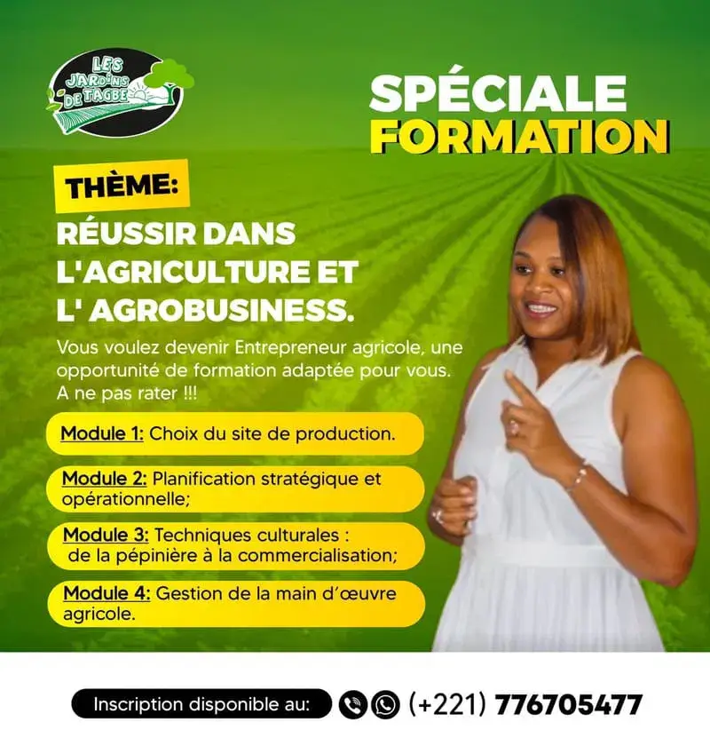 Renforcement de capacités pratiques en entrepreneuriat agricole, leadership rural, gestion de projets, commercialisation, production et transformation agroalimentaire.